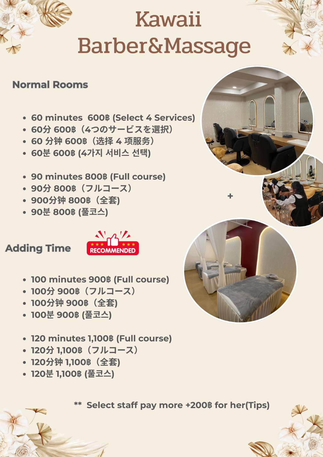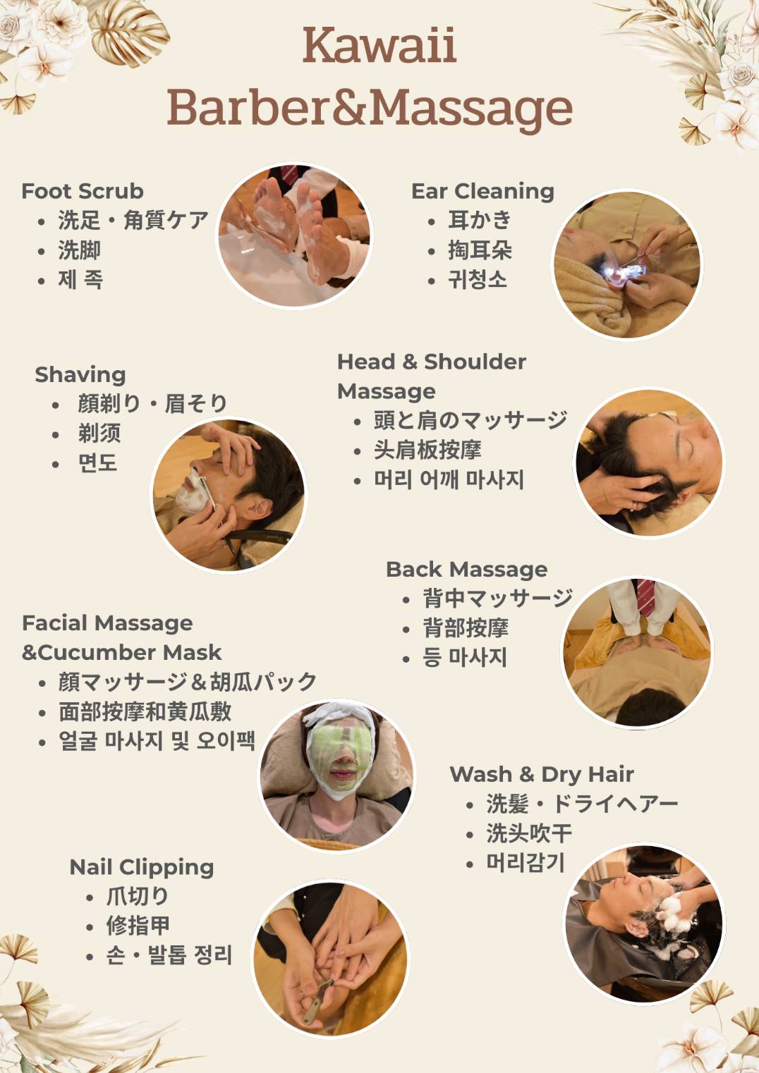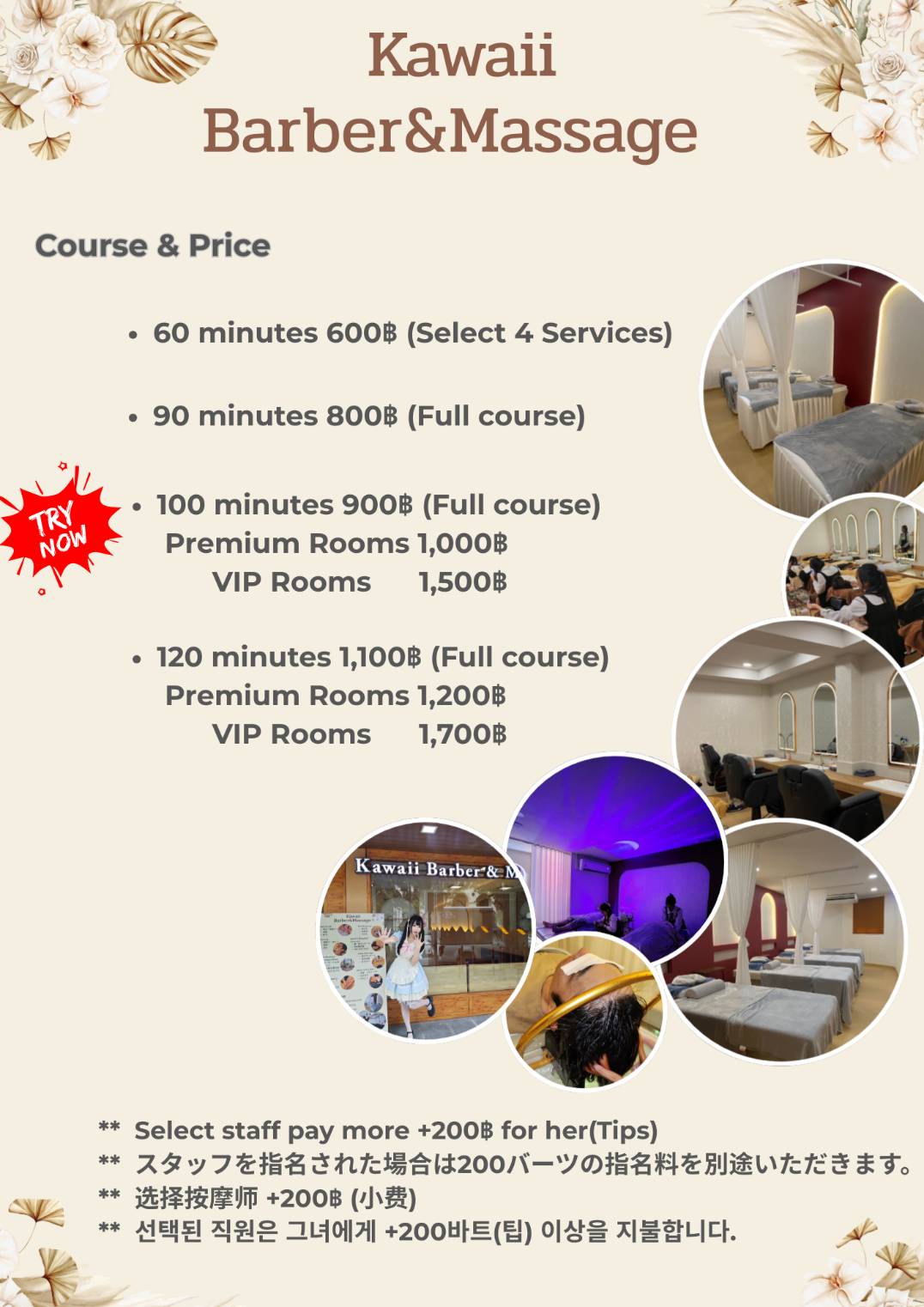 まだ一部の愛好家にしか知られていないベトナム式理髪店。ベトナム式理髪店とは、簡単に説明すると「古き良き日本の床屋の、ヘアカットを省いたサービスに特化した店」です。ベトナムで、床屋・理髪店・バーバー(Barber)への様々な需要の中から誕生したようです。タイにはバンコクのみならず、リゾート観光地のパタヤ等にも同様の店がありますが、2024年にはまだ数店舗しかない状況です。我々「Kawaii Barber&Massage」は、ベトナム式理髪店の良さを皆様に体験していただきたく、タイはバンコクのプロンポンに2024年2月に開店いたしました。朝の身だしなみに・異国でのリラクゼーションに・タイの旅の記念に・男性の美容に興味がある・異性から好かれたい・自分の気持ちを高めたい等、男性・女性どちらの様々な目的にお答えできるかと思います。どうぞお気軽にご来店くださいませ。