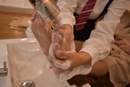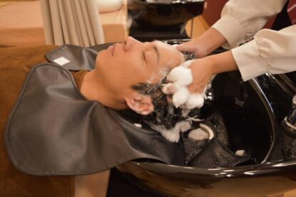 03. Foot Scrub | 2階のお部屋に移動していただき、これまた「超リラックスできる」バーバーチェアーにお掛けいただきます。スタッフ誘導の元、足を洗面器で洗わせていただき、その後足の爪のケアをさせていただきます |
